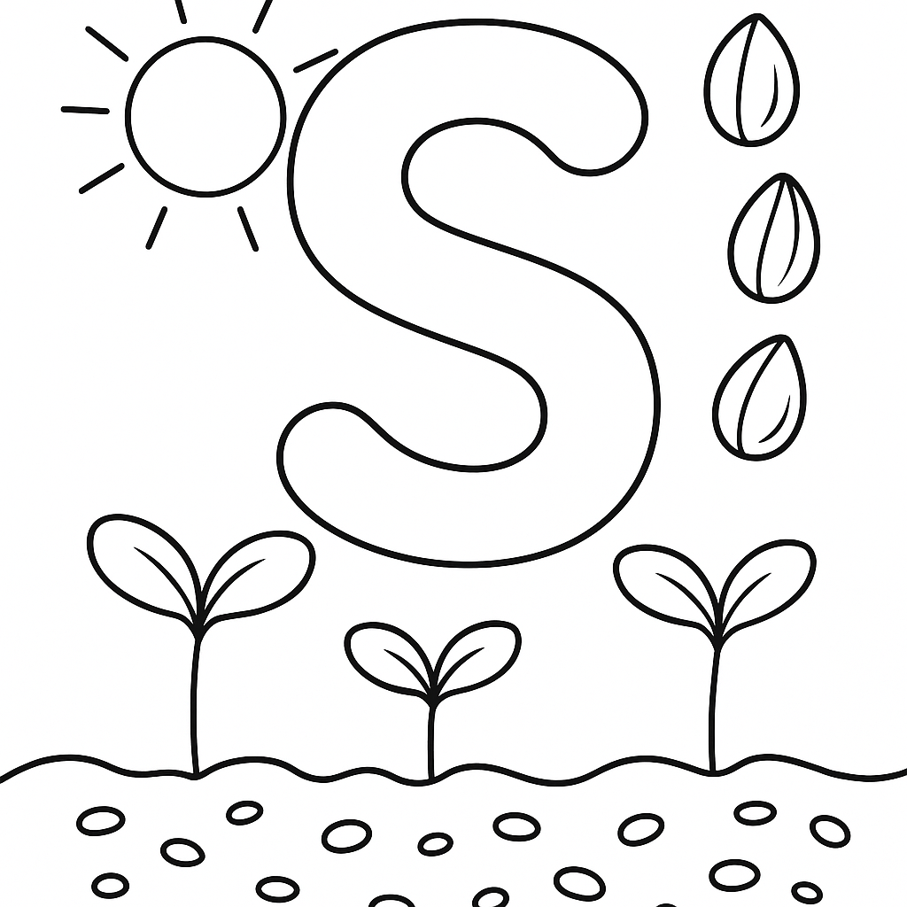 A simple coloring page featuring letter S with spring words: sun, seeds, sprouts, and soil. Perfect for kids (4-6) with large, bold outlines for a fun coloring experience.