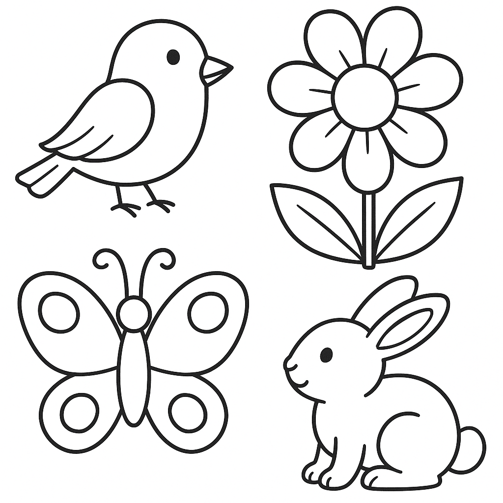 A simple coloring page featuring spring words beginning with letter sounds and pictures. Perfect for kids (4-6) with large, bold outlines for a fun coloring experience.