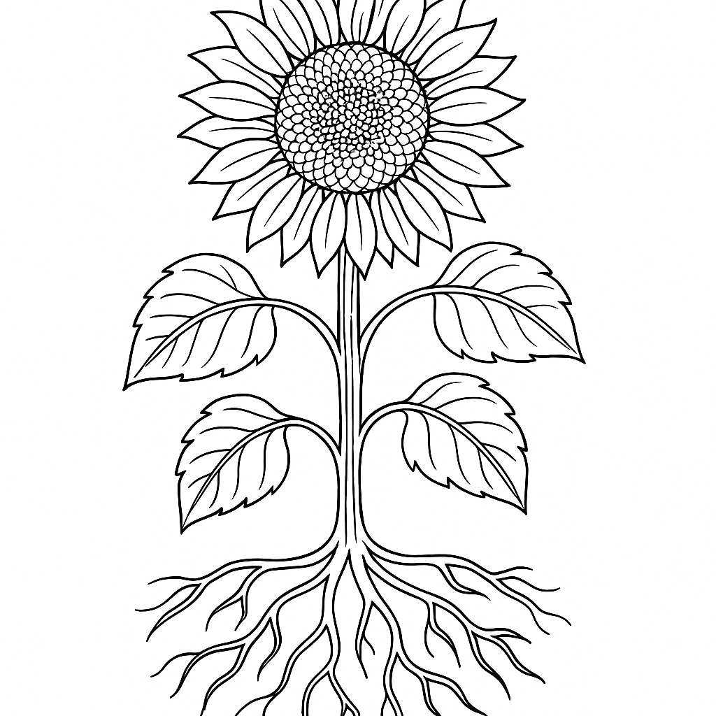 A detailed coloring page featuring a detailed diagram of a flower showing petals, stem, and roots with labels. Perfect for tweens (9-12) with intricate detail for a fun coloring experience.