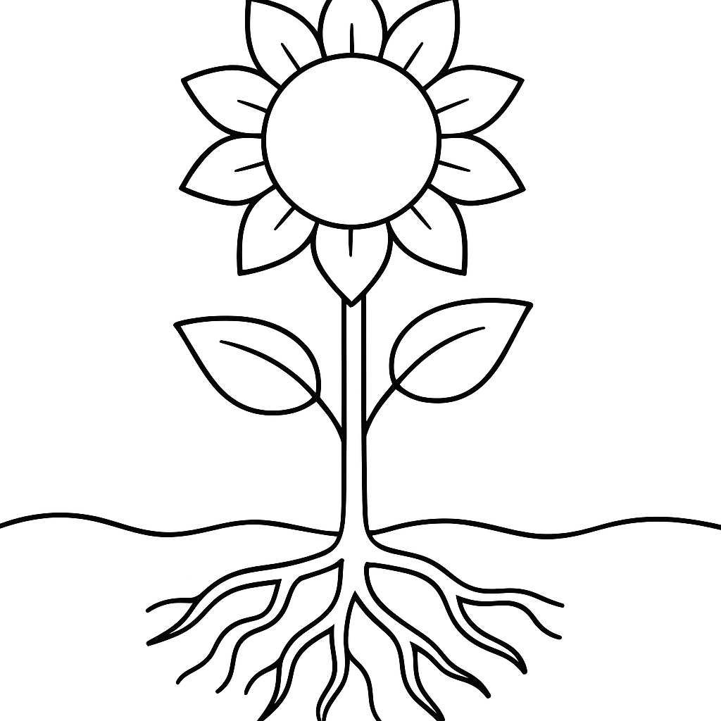 A simple coloring page featuring a seed sprouting into a sunflower with roots showing. Perfect for kids (4-6) with large, bold outlines for a fun coloring experience.