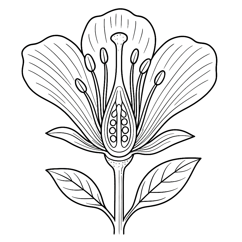 A detailed coloring page featuring cross-section diagram of flower parts. Perfect for tweens (9-12) with intricate detail for a fun coloring experience.