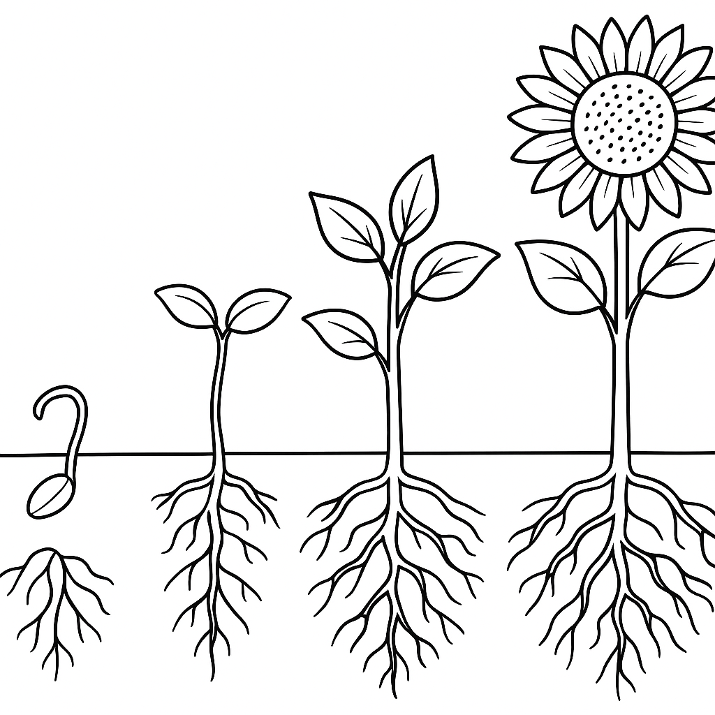 A medium coloring page featuring diagram of a seed growing into a sunflower with roots and stages. Perfect for kids (6-9) with moderately detailed outlines for a fun coloring experience.