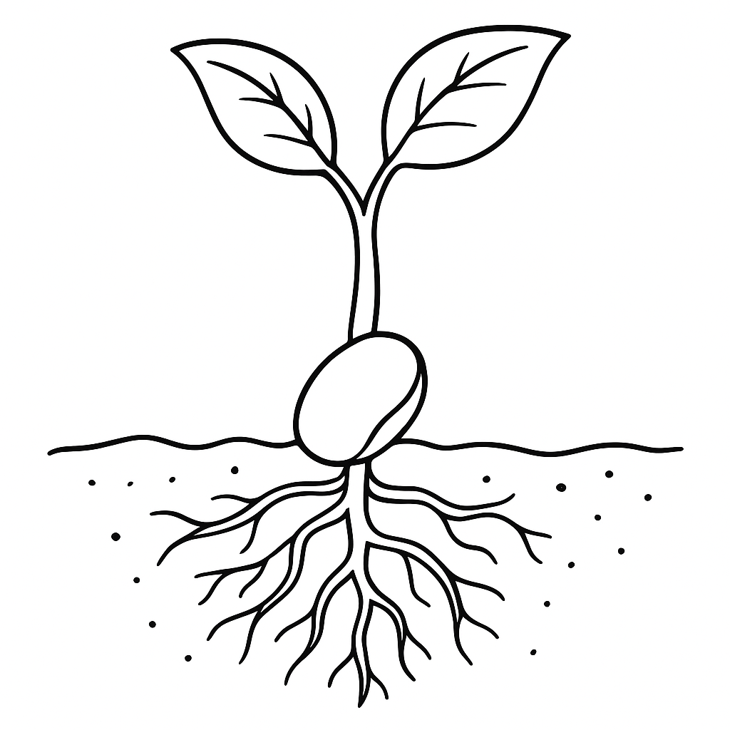 A medium coloring page featuring seed sprouting diagram showing roots and first leaves. Perfect for kids (6-9) with moderately detailed outlines for a fun coloring experience.