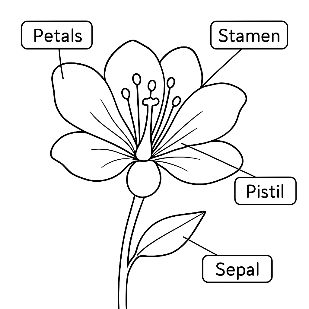 A medium coloring page featuring the parts of a flower labeled for learning. Perfect for kids (6-9) with moderately detailed outlines for a fun coloring experience.
