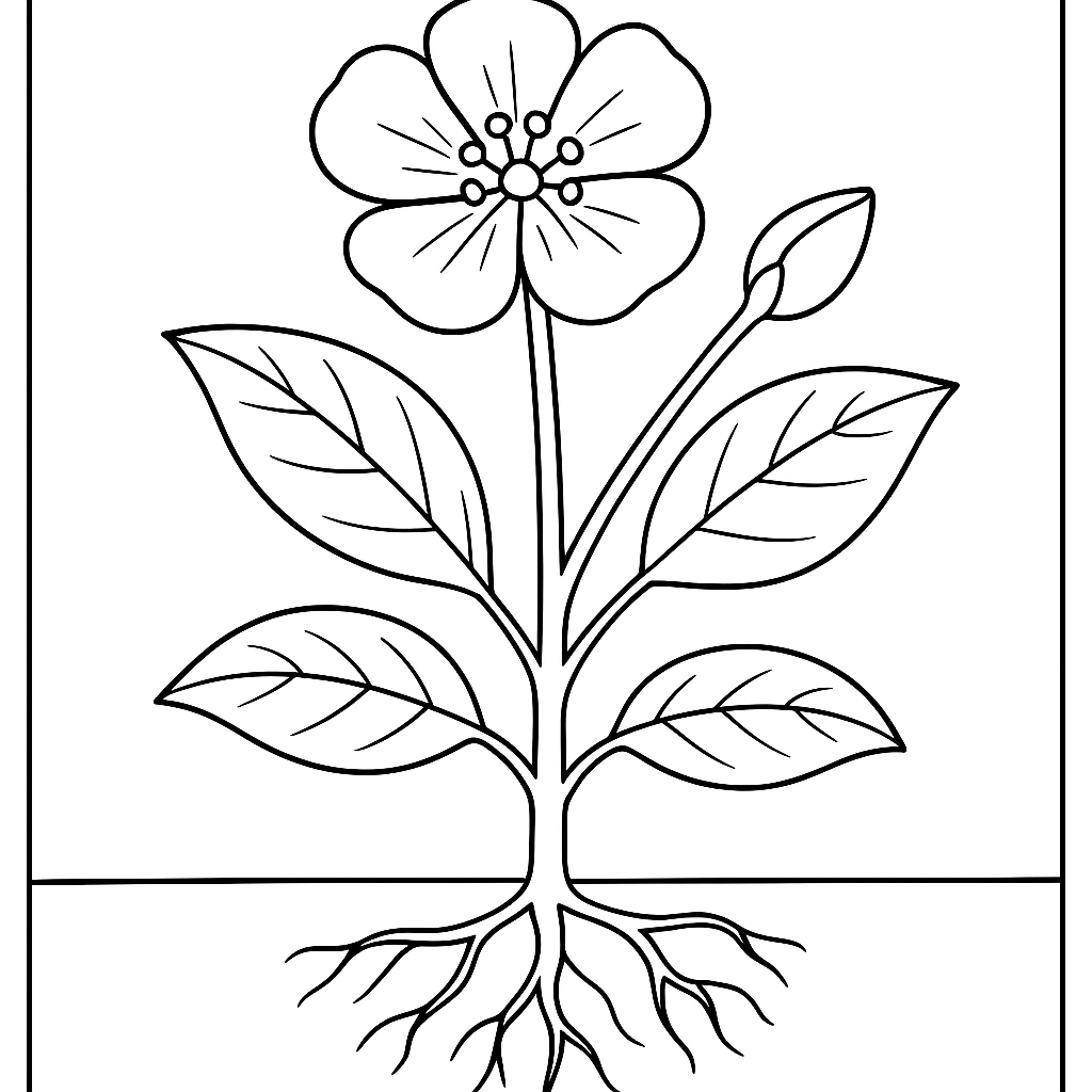 A medium coloring page featuring the parts of a flowering plant with labels. Perfect for kids (6-9) with moderately detailed outlines for a fun coloring experience.