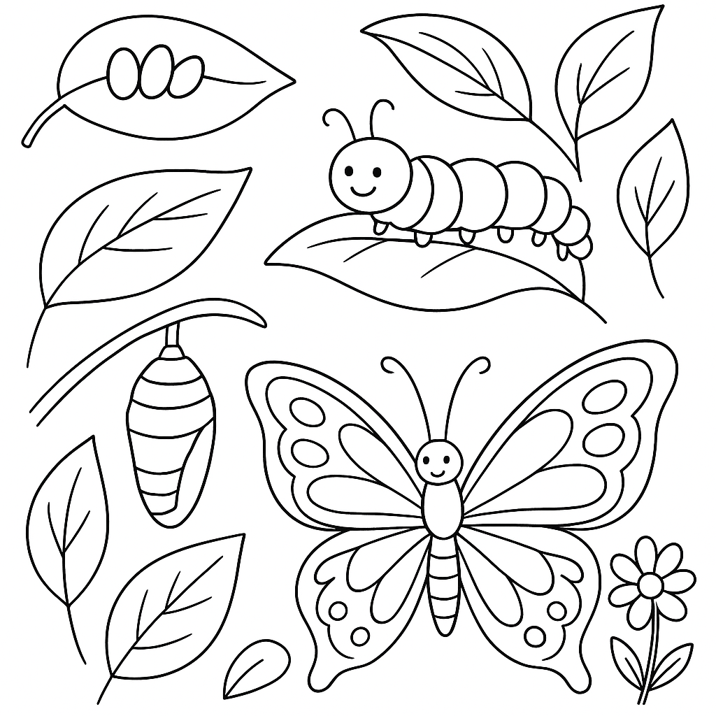 A medium coloring page featuring butterfly life cycle from egg to chrysalis to butterfly. Perfect for kids (6-9) with moderately detailed outlines for a fun coloring experience.
