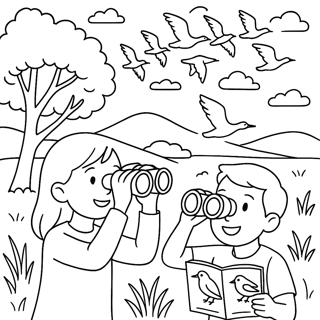 A medium coloring page featuring children observing bird migration with binoculars and field guide. Perfect for kids (6-9) with moderately detailed outlines for a fun coloring experience.