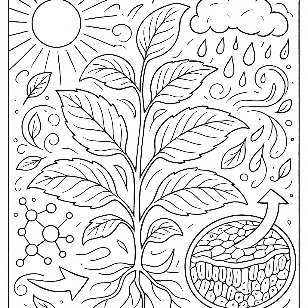 A detailed coloring page featuring photosynthesis diagram with spring leaves. Perfect for tweens (9-12) with intricate detail for a fun coloring experience.
