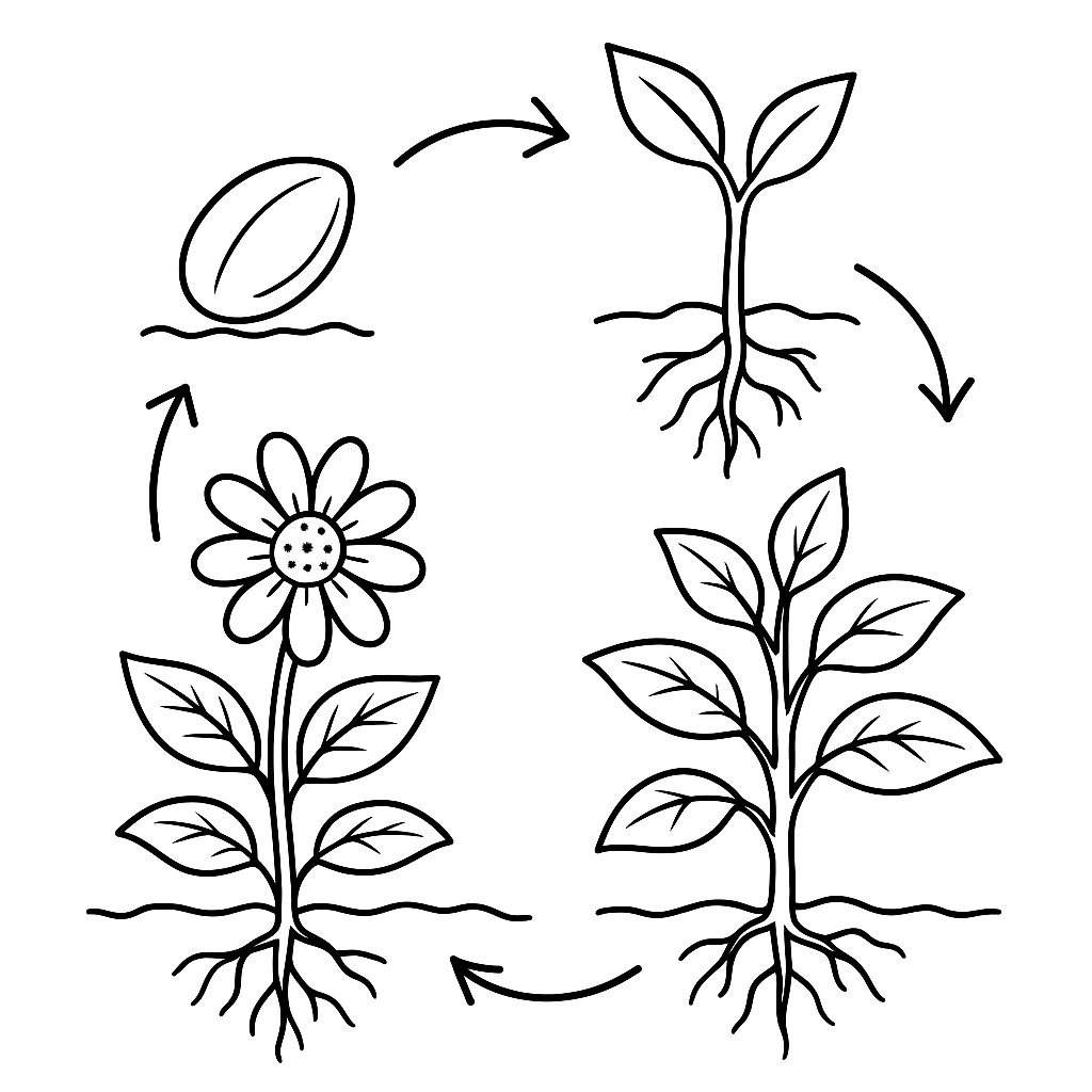 A medium coloring page featuring plant life cycle from seed to flowering. Perfect for kids (6-9) with moderately detailed outlines for a fun coloring experience.