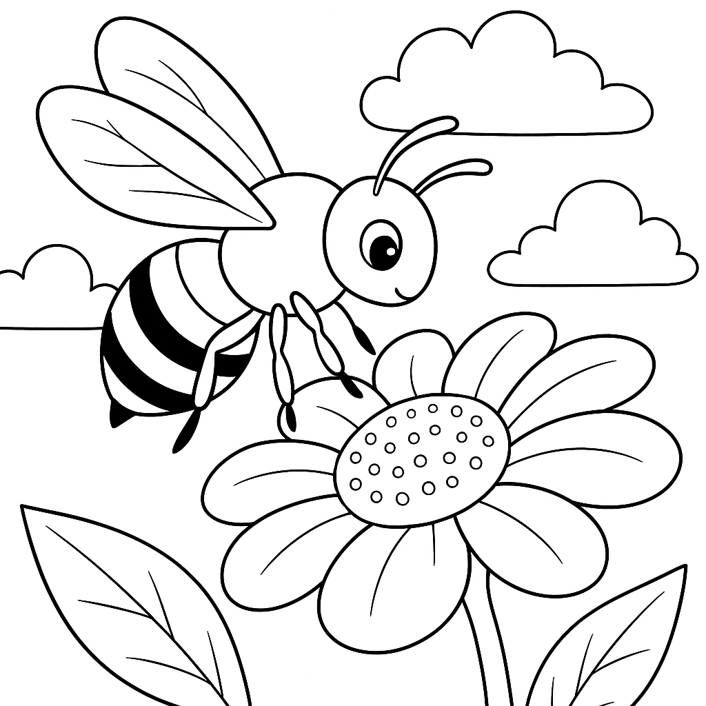 A medium coloring page featuring pollination process with bee and flower. Perfect for kids (6-9) with moderately detailed outlines for a fun coloring experience.
