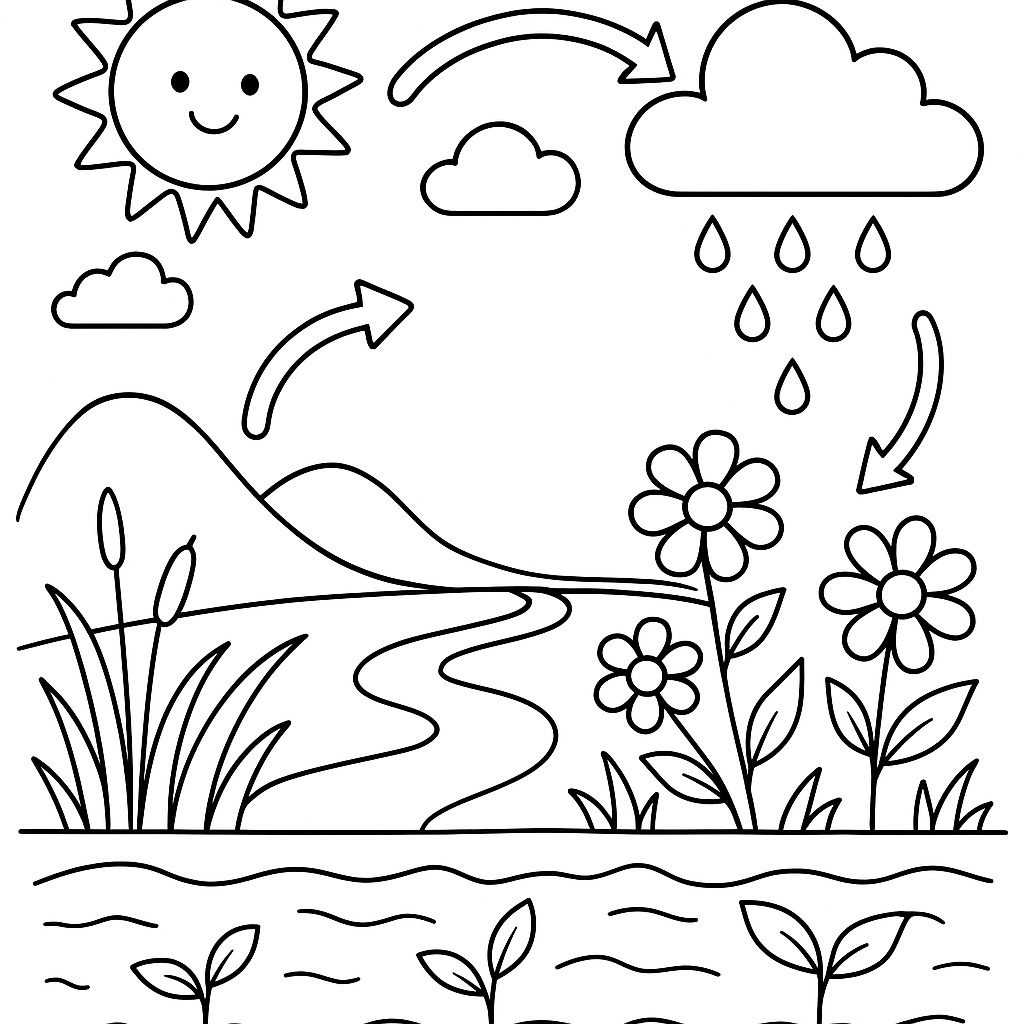 A medium coloring page featuring the water cycle with spring rain and growth. Perfect for kids (6-9) with moderately detailed outlines for a fun coloring experience.