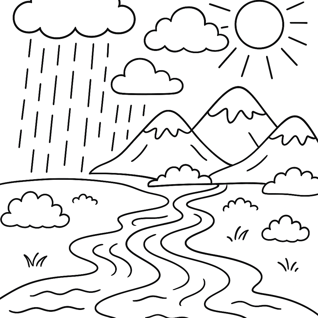 A medium coloring page featuring water cycle diagram with clouds rain and rivers. Perfect for kids (6-9) with moderately detailed outlines for a fun coloring experience.