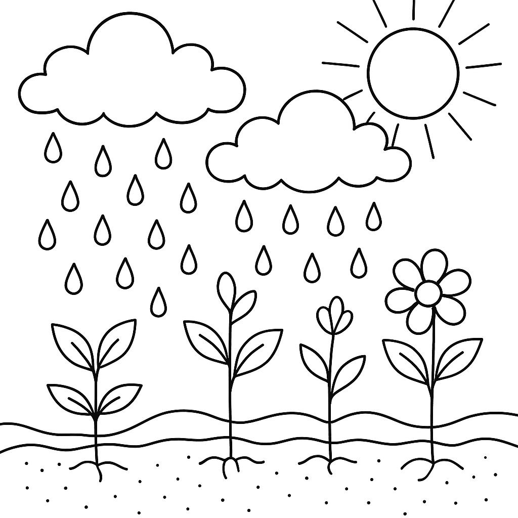 A medium coloring page featuring water cycle diagram with spring rain and growing plants. Perfect for kids (6-9) with moderately detailed outlines for a fun coloring experience.