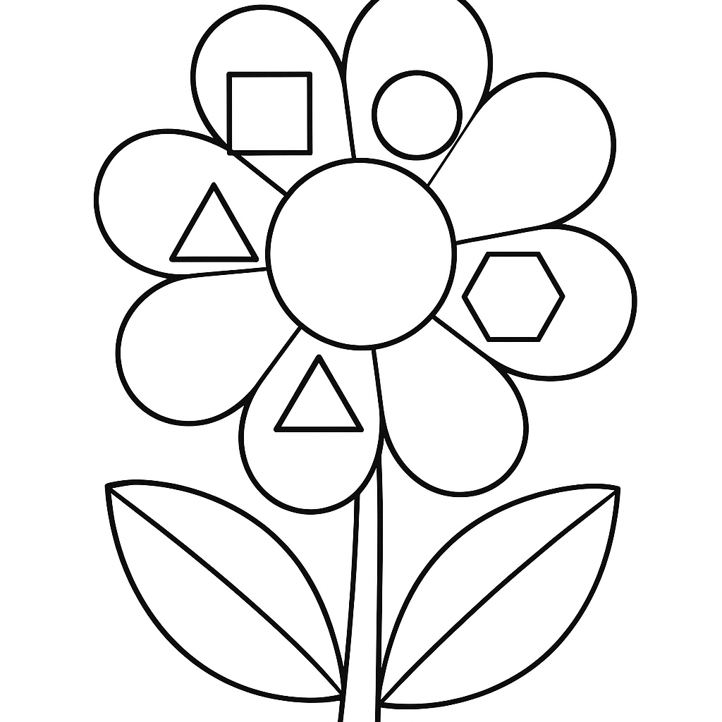 A simple coloring page featuring geometric shapes hidden in flower petals. Perfect for kids (4-6) with large, bold outlines for a fun coloring experience.