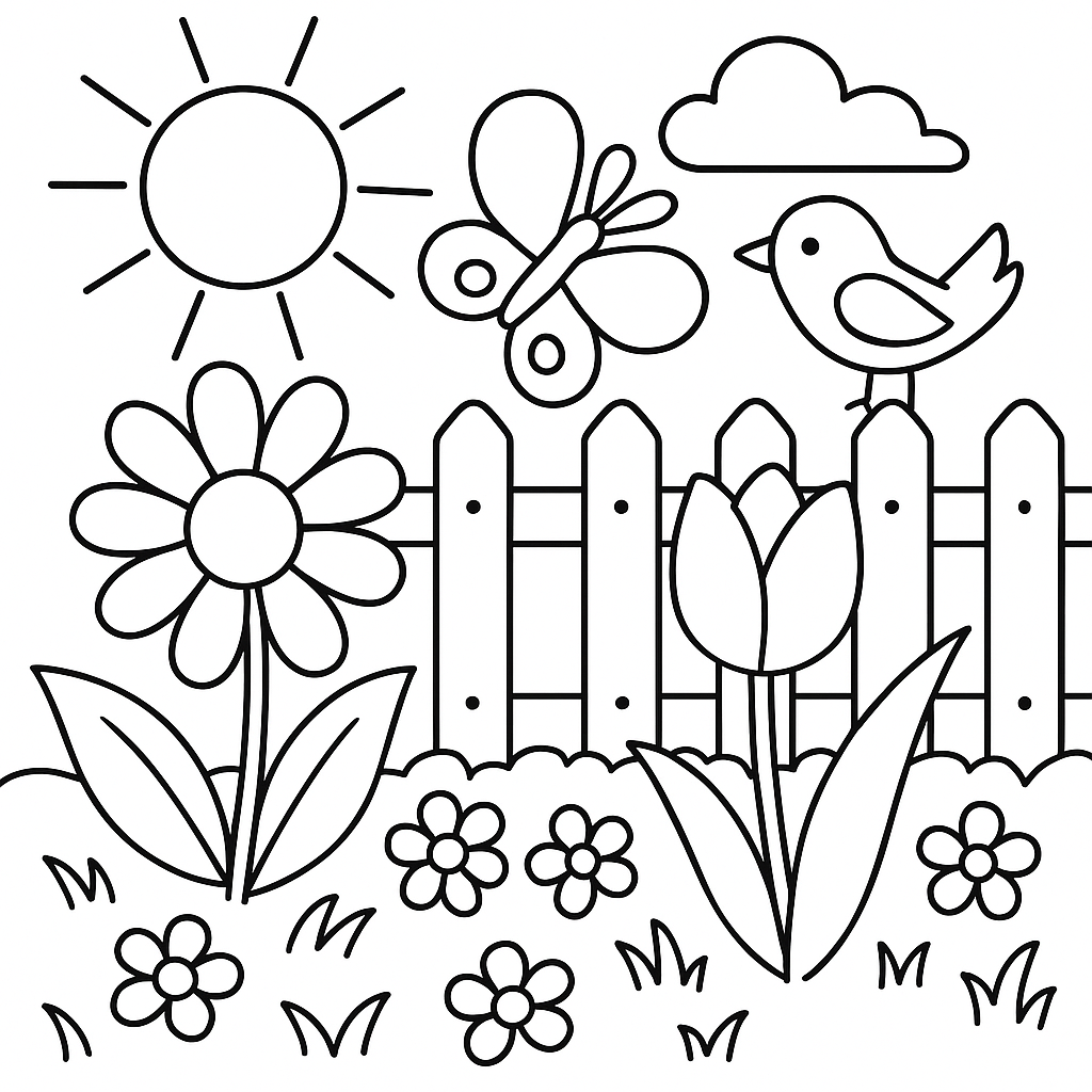 A simple coloring page featuring spring sight words hidden in garden scene. Perfect for kids (4-6) with large, bold outlines for a fun coloring experience.