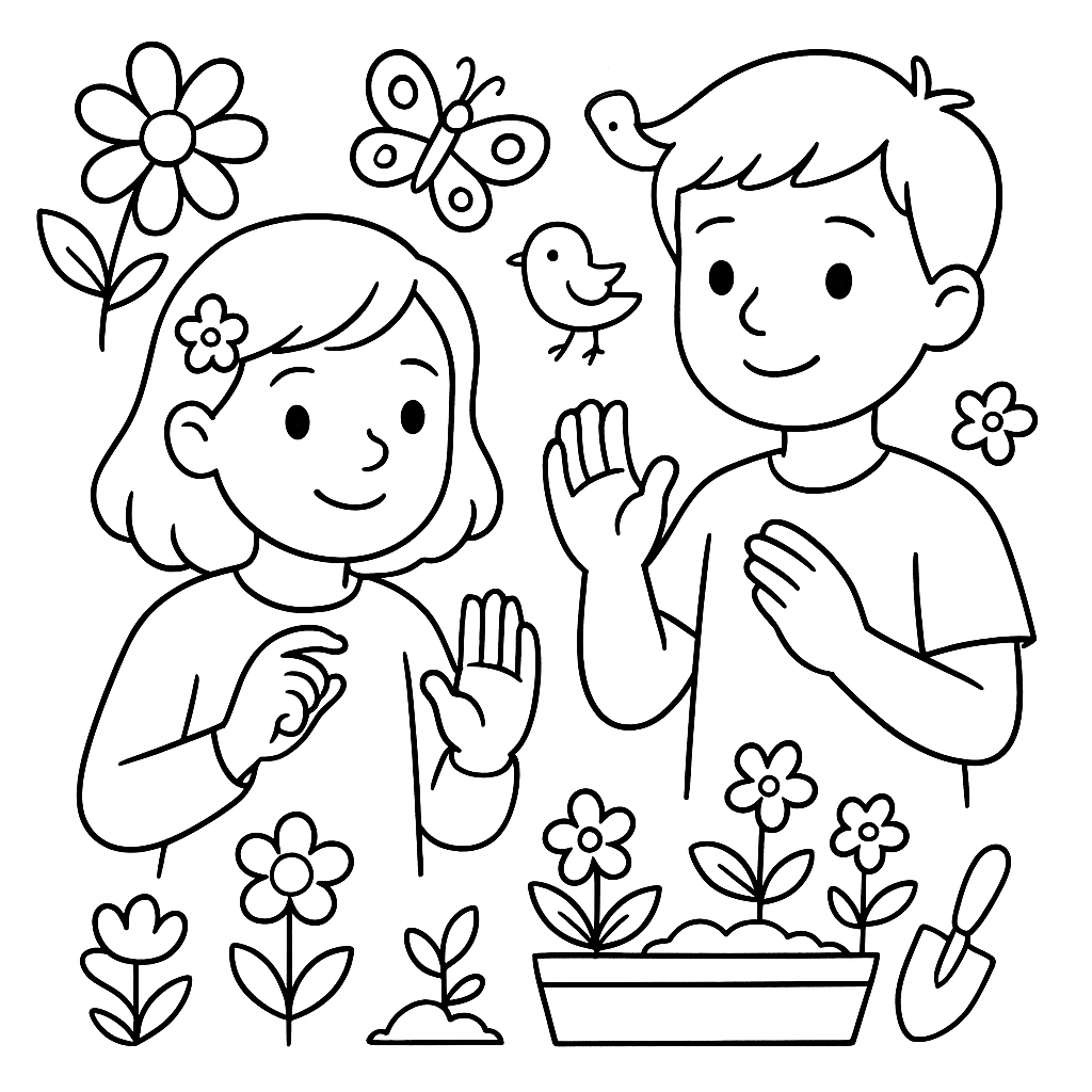 A medium coloring page featuring sign language for spring and garden words. Perfect for kids (6-9) with moderately detailed outlines for a fun coloring experience.