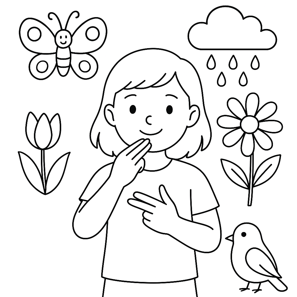 A medium coloring page featuring sign language for spring vocabulary with picture symbols. Perfect for kids (6-9) with moderately detailed outlines for a fun coloring experience.