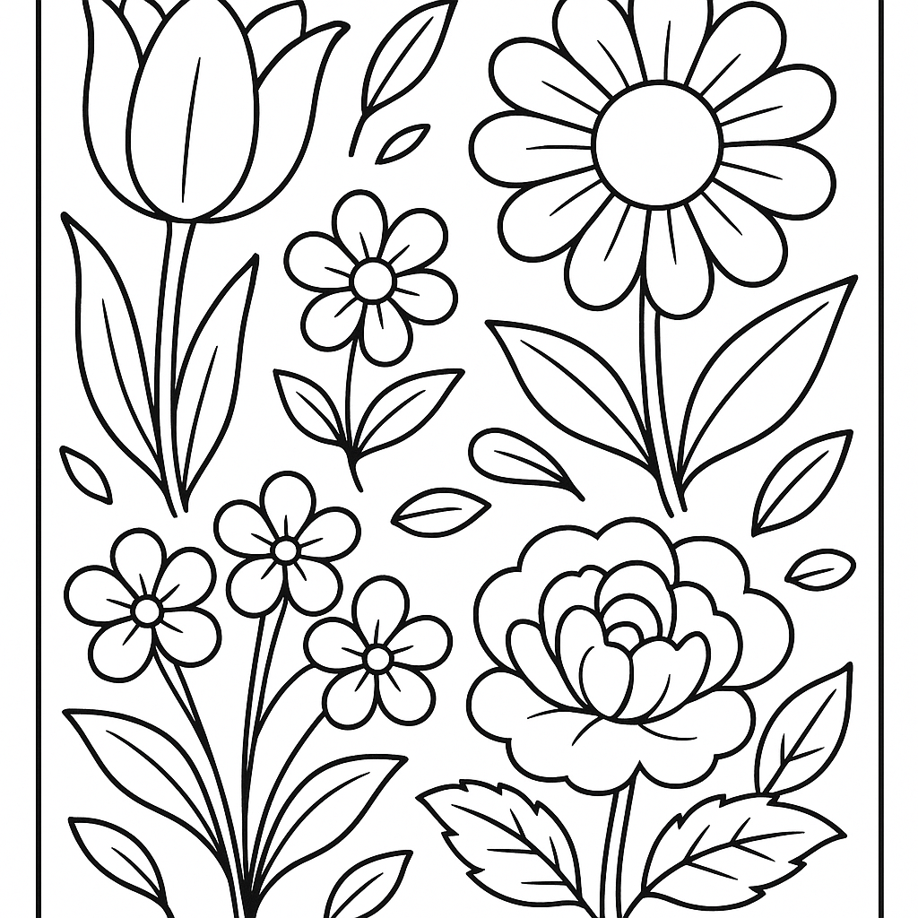 A simple coloring page featuring spring vocabulary words in English and Spanish with pictures. Perfect for kids (4-6) with large, bold outlines for a fun coloring experience.