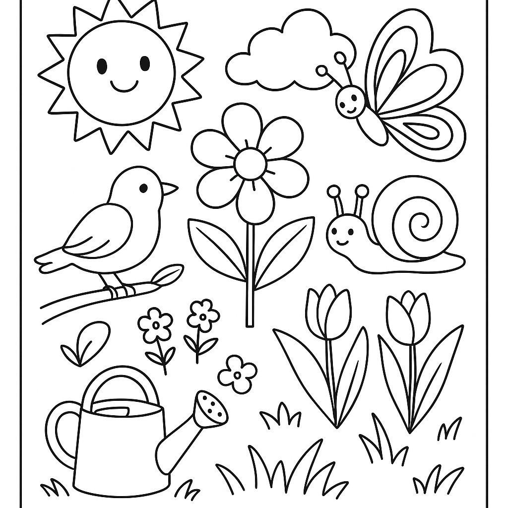 A medium coloring page featuring spring vocabulary words in english and spanish. Perfect for kids (6-9) with moderately detailed outlines for a fun coloring experience.