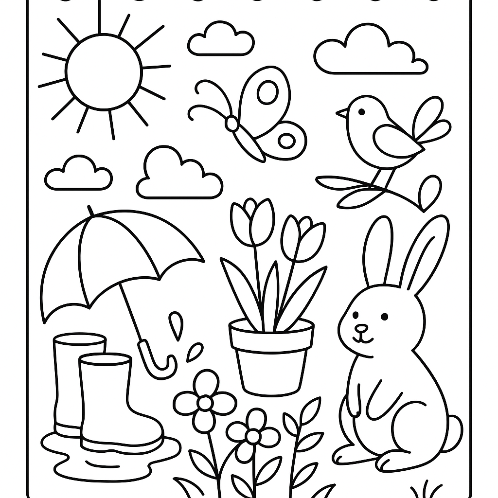A medium coloring page featuring a spring calendar showing April activities. Perfect for kids (6-9) with moderately detailed outlines for a fun coloring experience.