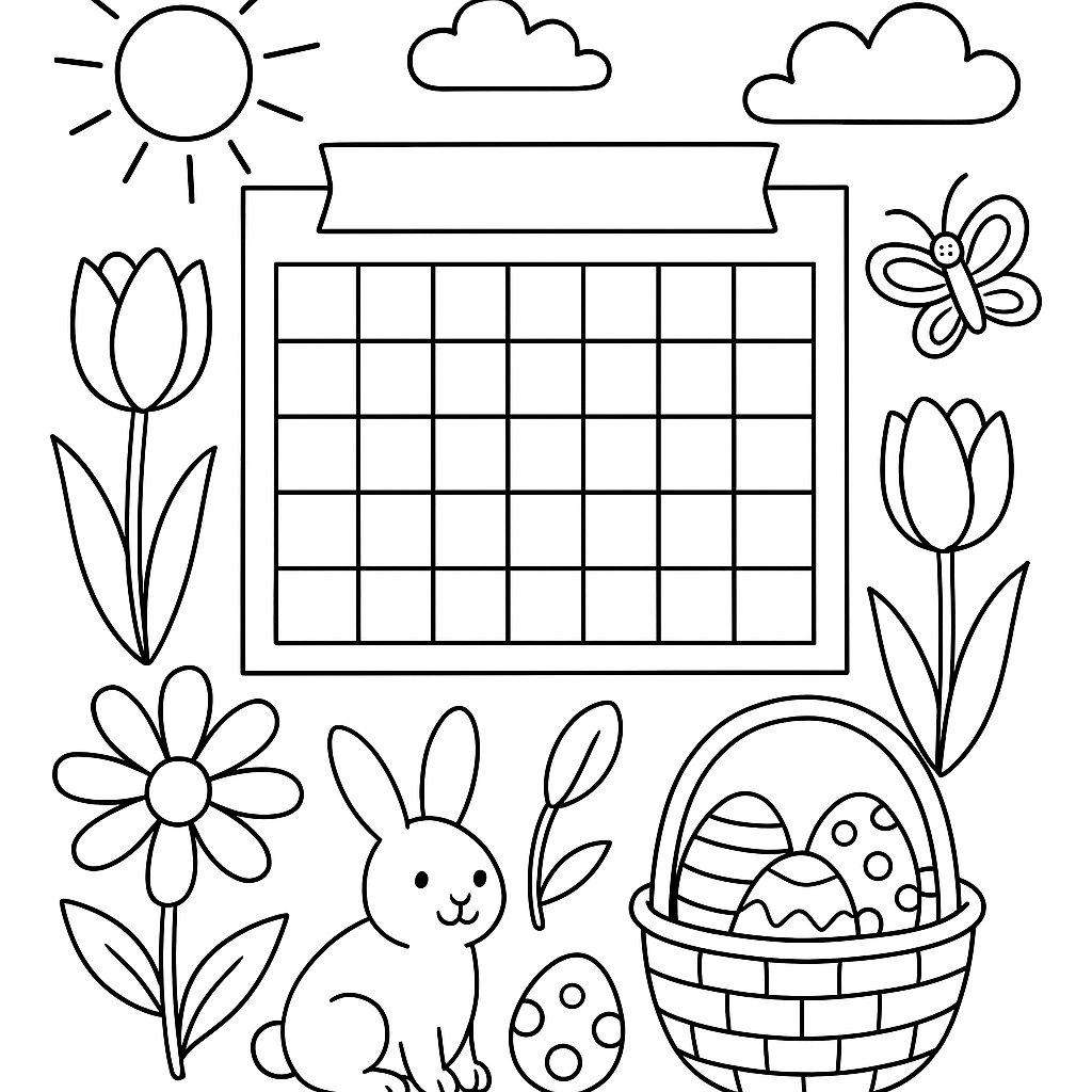 A medium coloring page featuring April calendar page with spring holidays marked. Perfect for kids (6-9) with moderately detailed outlines for a fun coloring experience.