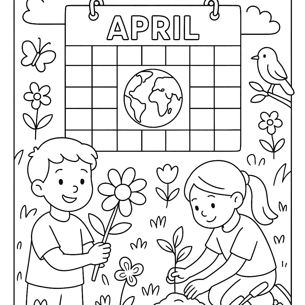 A medium coloring page featuring april calendar with earth day marked and spring activities. Perfect for kids (6-9) with moderately detailed outlines for a fun coloring experience.