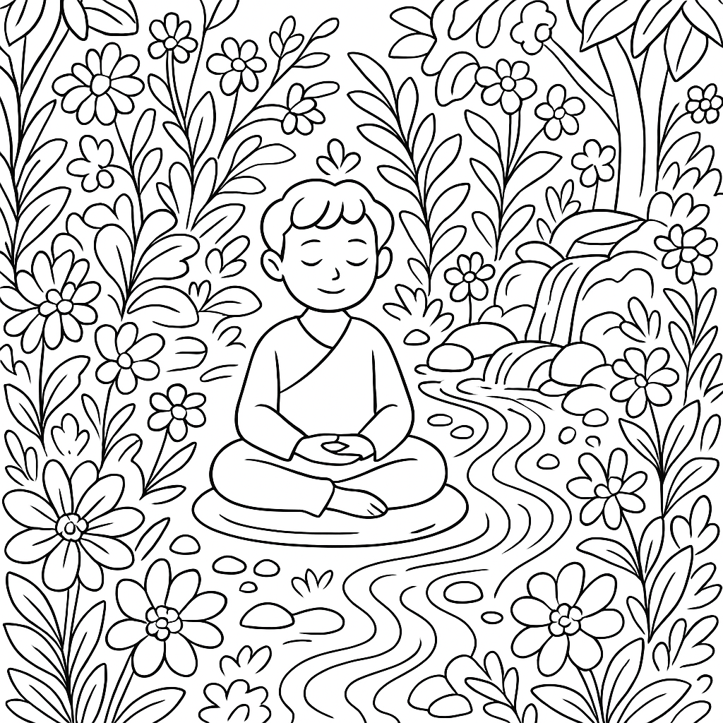 A detailed coloring page featuring a peaceful meditation garden with flowing water and flowers. Perfect for tweens (9-12) with intricate detail for a fun coloring experience.