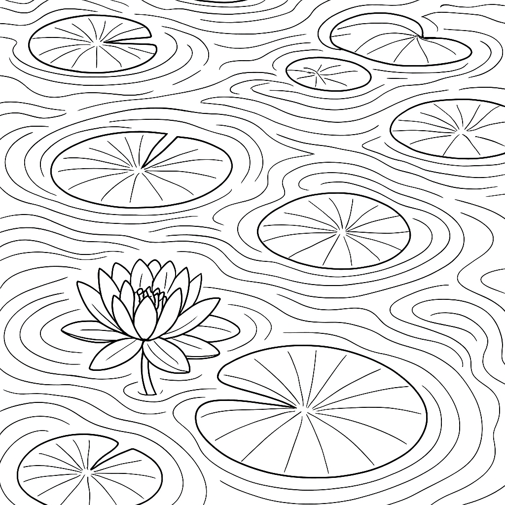 A detailed coloring page featuring peaceful pond with lily pads and gentle ripples. Perfect for tweens (9-12) with intricate detail for a fun coloring experience.