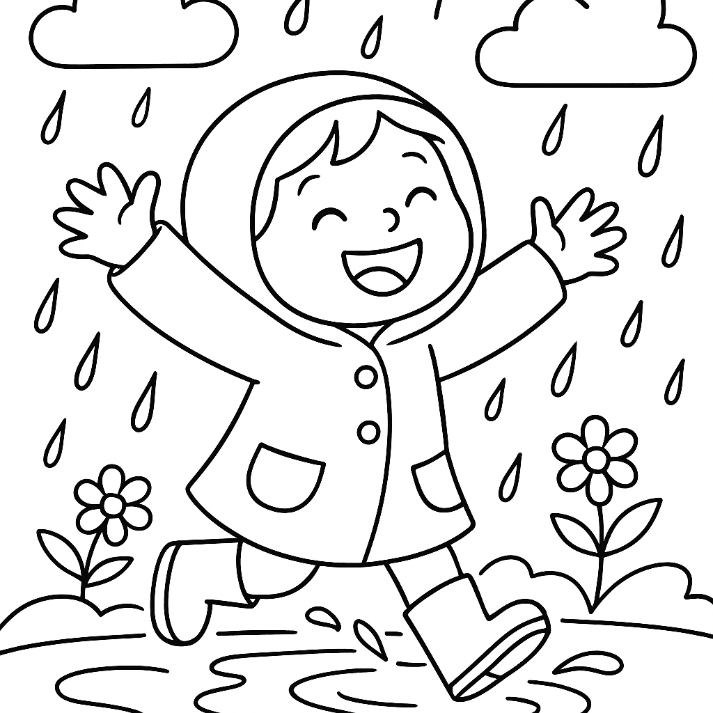 A simple coloring page featuring a child expressing joy while playing in spring rain. Perfect for kids (4-6) with large, bold outlines for a fun coloring experience.
