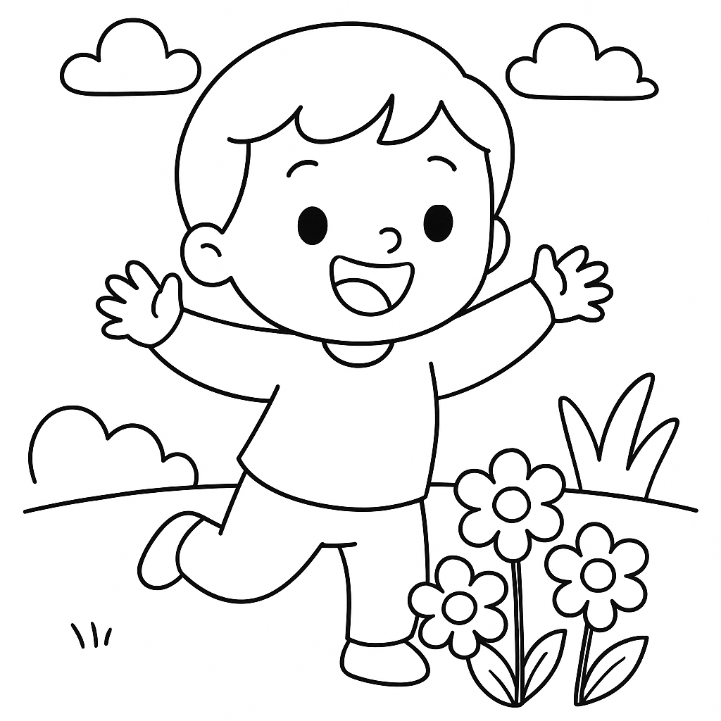 A simple coloring page featuring child expressing joy while discovering first spring flowers. Perfect for toddlers (2-4) with large, bold outlines for a fun coloring experience.