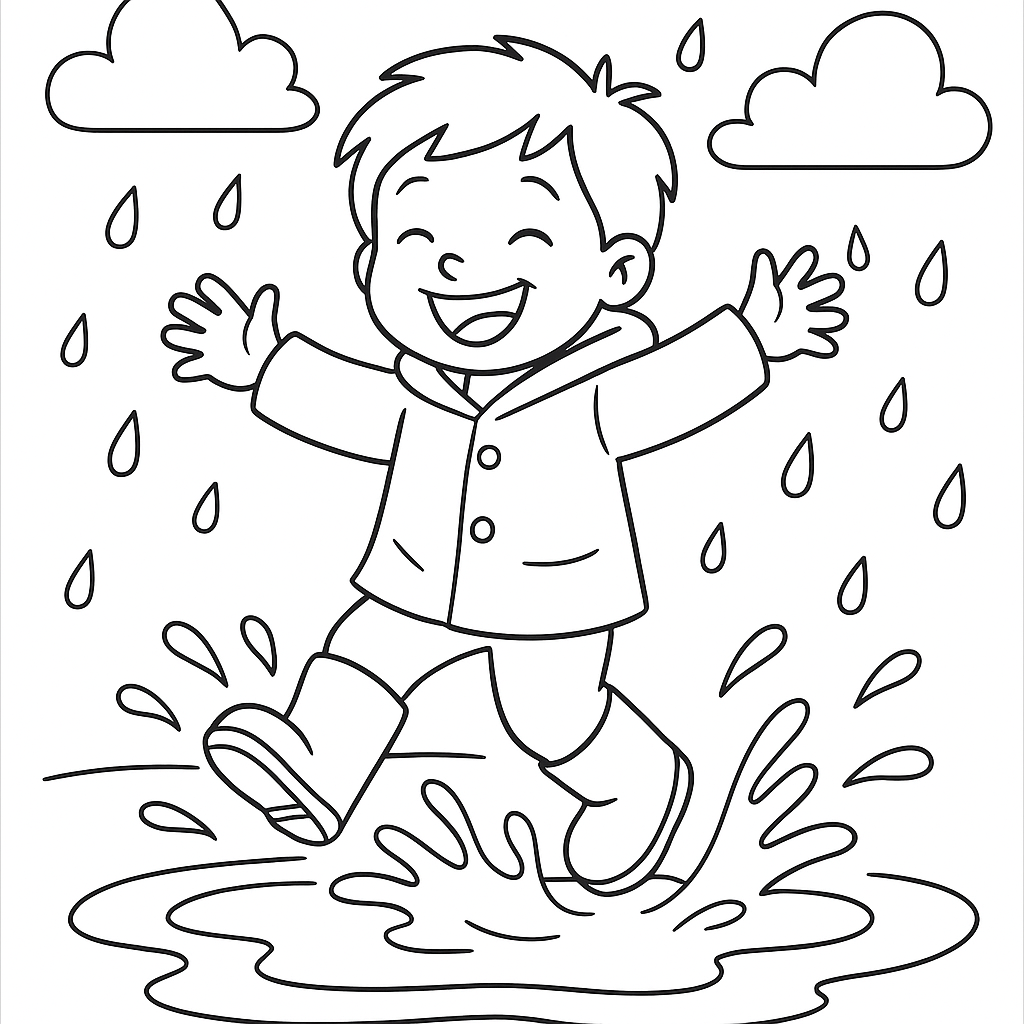 A simple coloring page featuring happy child jumping in puddles with joy. Perfect for kids (4-6) with large, bold outlines for a fun coloring experience.