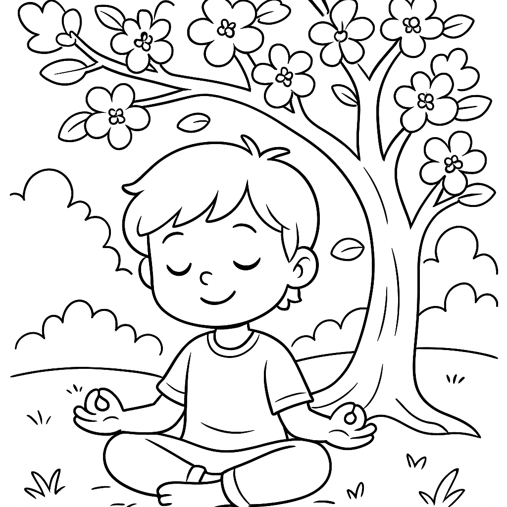 A medium coloring page featuring child meditating peacefully in a garden surrounded by butterflies. Perfect for kids (6-9) with moderately detailed outlines for a fun coloring experience.