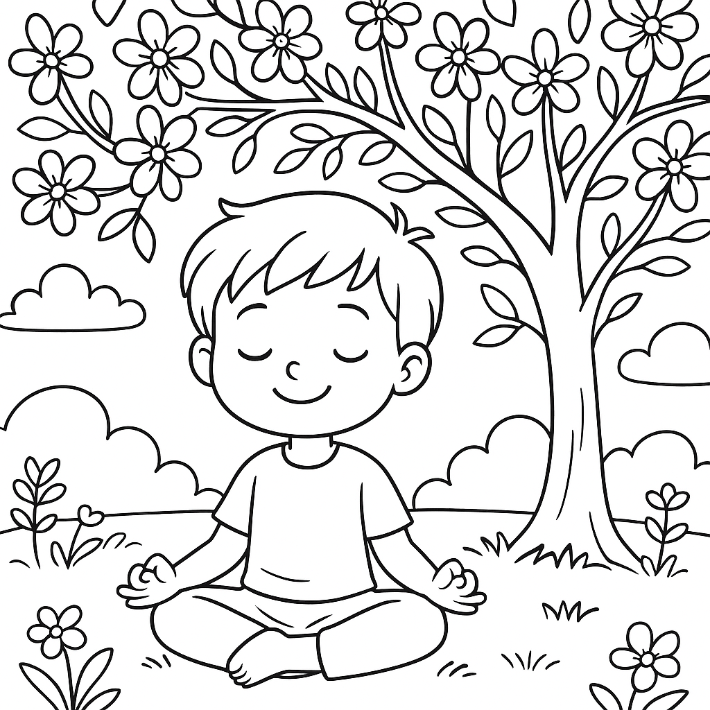 A medium coloring page featuring child meditating under blooming tree. Perfect for kids (6-9) with moderately detailed outlines for a fun coloring experience.