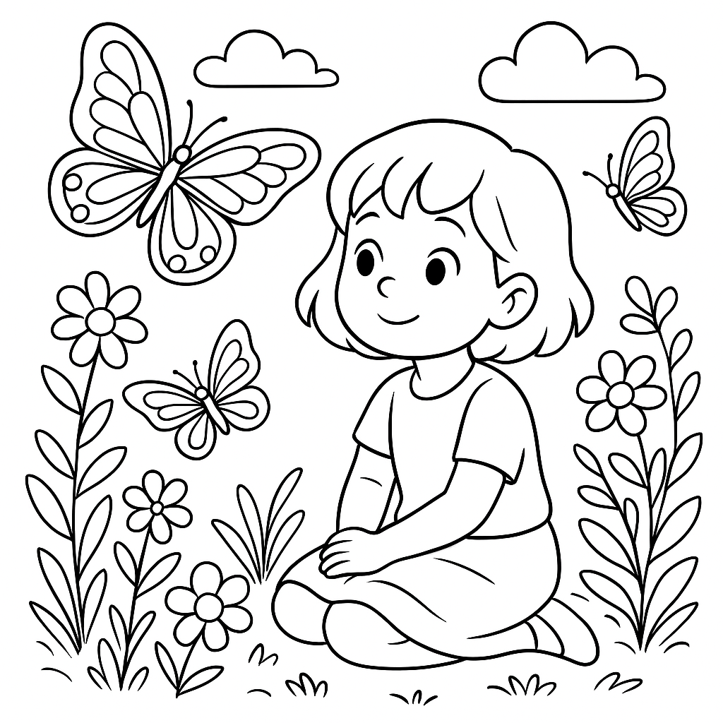 A medium coloring page featuring child sitting quietly observing butterflies in garden. Perfect for kids (6-9) with moderately detailed outlines for a fun coloring experience.
