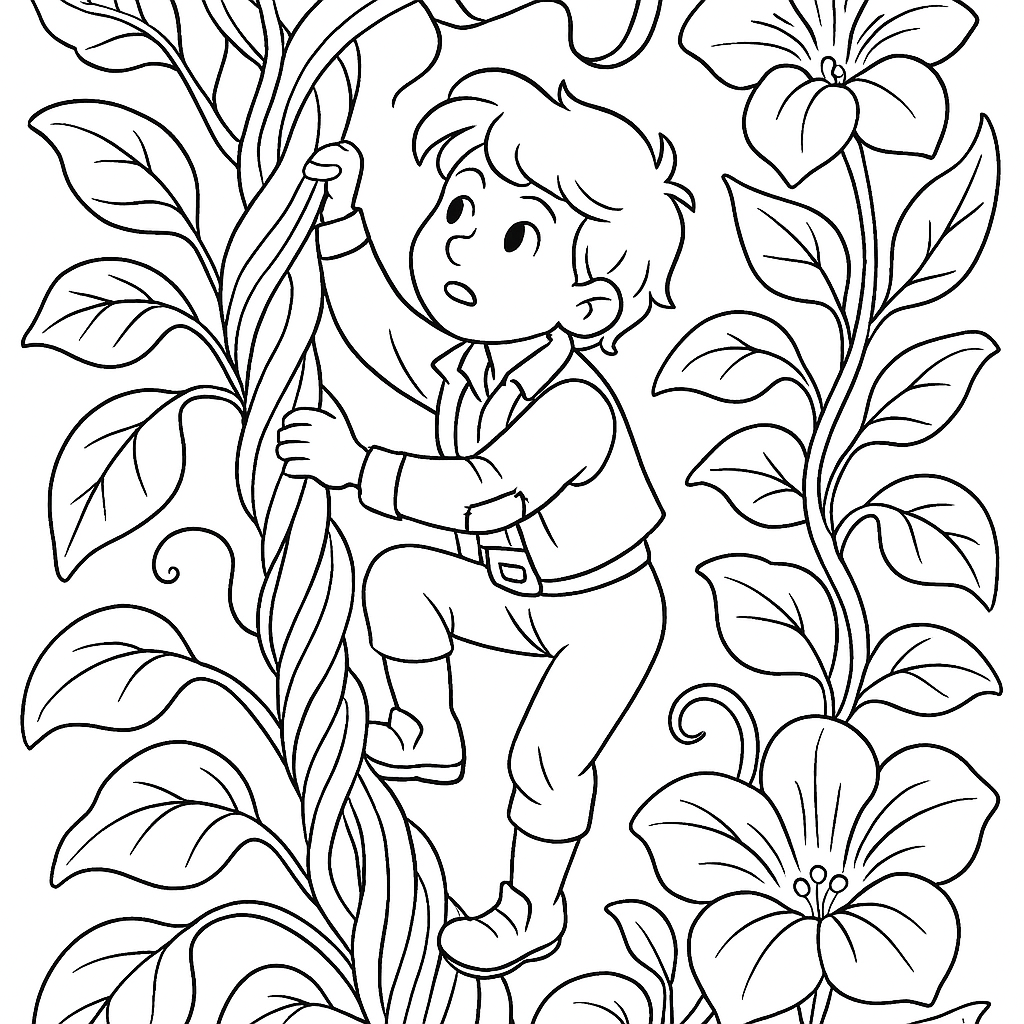 A detailed coloring page featuring Jack climbing the beanstalk reaching toward giant castle. Perfect for kids (6-9) with intricate detail for a fun coloring experience.