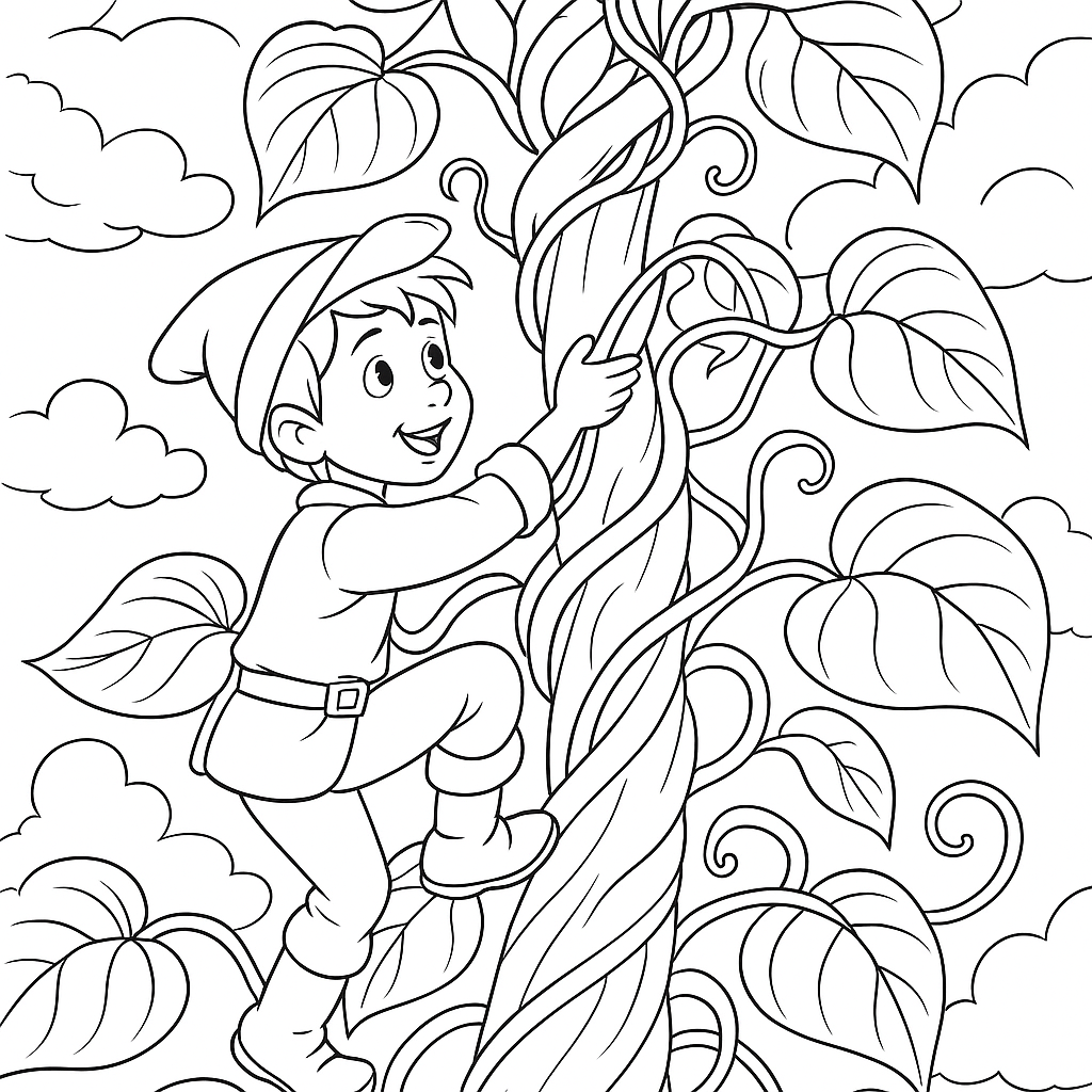 A simple coloring page featuring Jack climbing the beanstalk through the clouds. Perfect for kids (4-6) with large, bold outlines for a fun coloring experience.