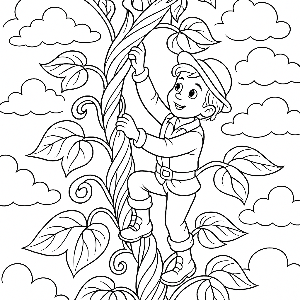 A detailed coloring page featuring Jack climbing the beanstalk with giant leaves. Perfect for kids (6-9) with intricate detail for a fun coloring experience.