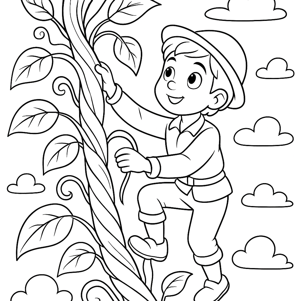 A medium coloring page featuring jack climbing the beanstalk with spring leaves. Perfect for kids (6-9) with moderately detailed outlines for a fun coloring experience.