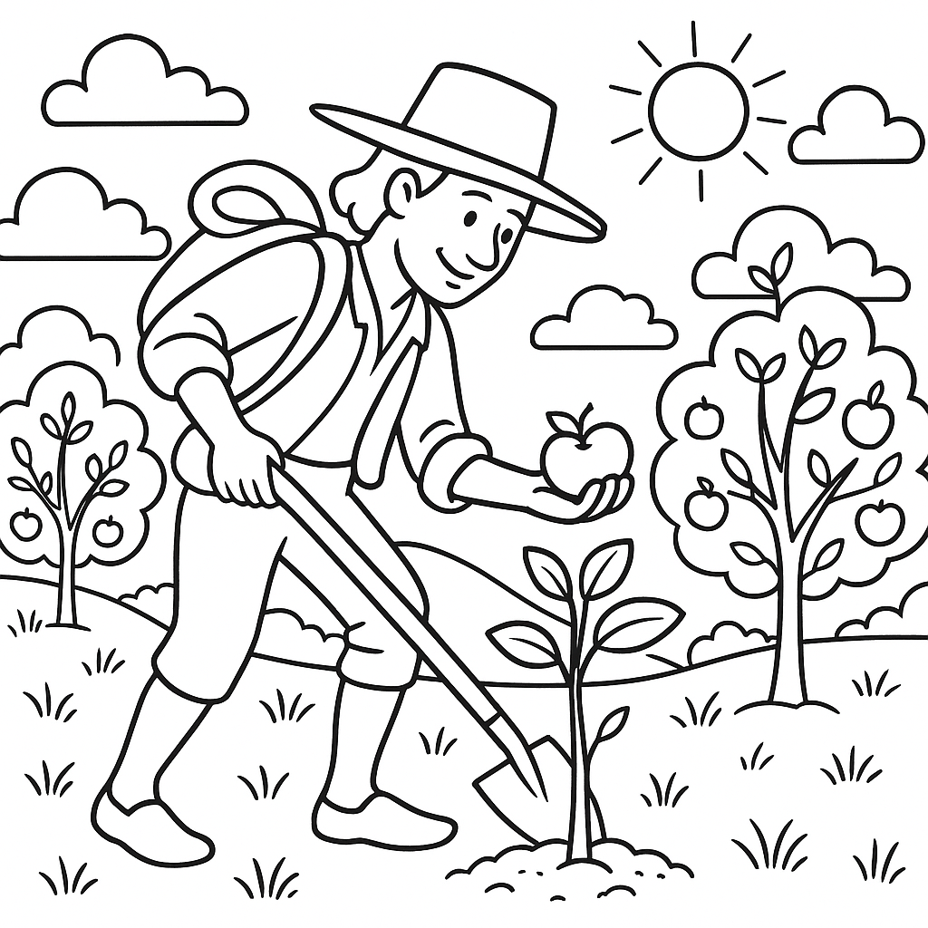 A medium coloring page featuring Johnny Appleseed planting apple trees across the countryside. Perfect for kids (6-9) with moderately detailed outlines for a fun coloring experience.