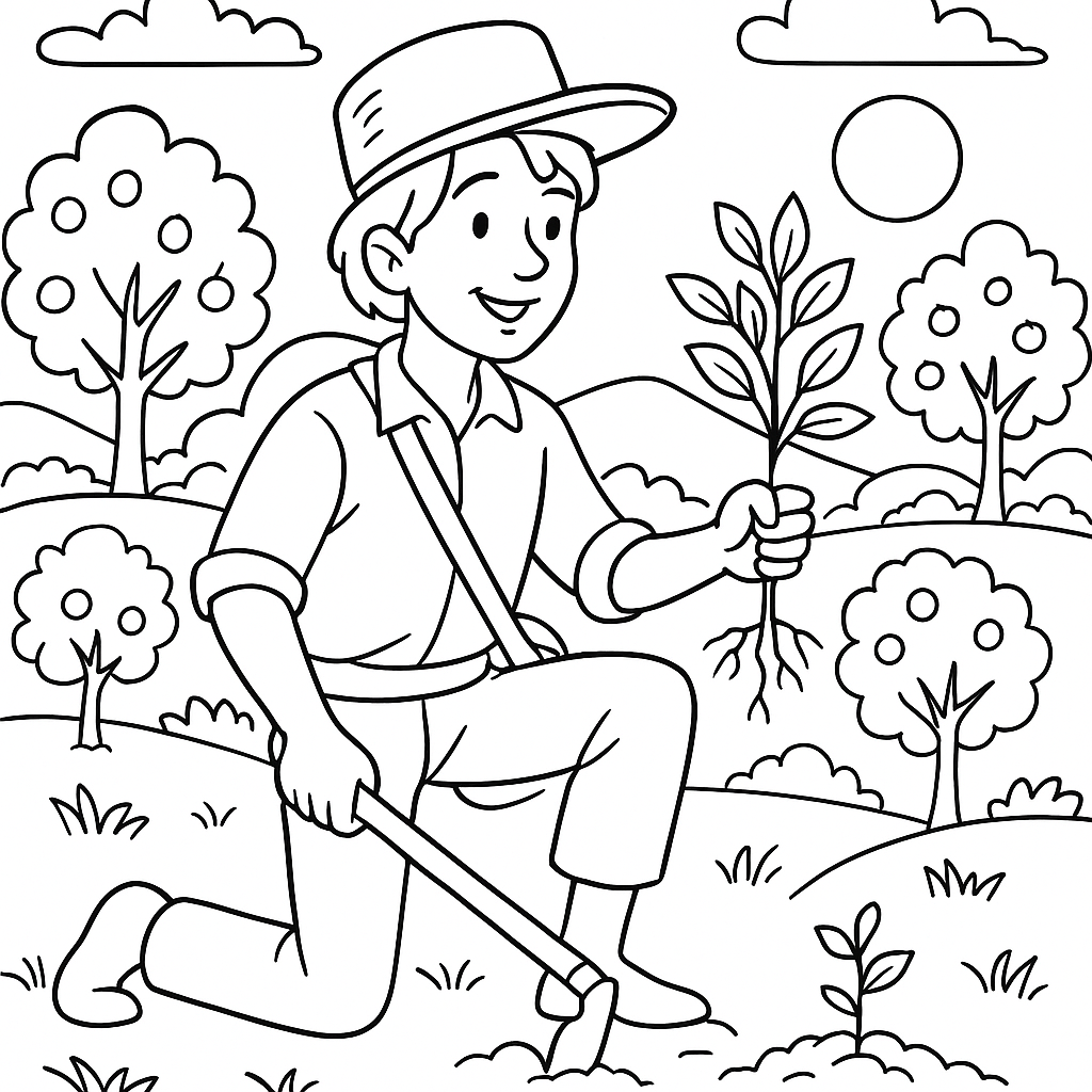 A medium coloring page featuring Johnny Appleseed planting trees across the countryside. Perfect for kids (6-9) with moderately detailed outlines for a fun coloring experience.