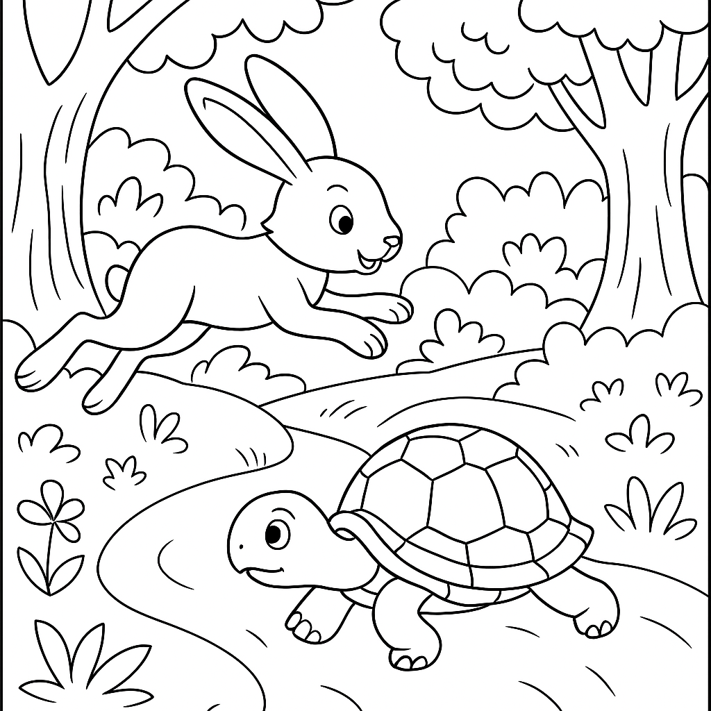 A simple coloring page featuring tortoise and hare race through spring meadow with wildflowers. Perfect for kids (4-6) with large, bold outlines for a fun coloring experience.