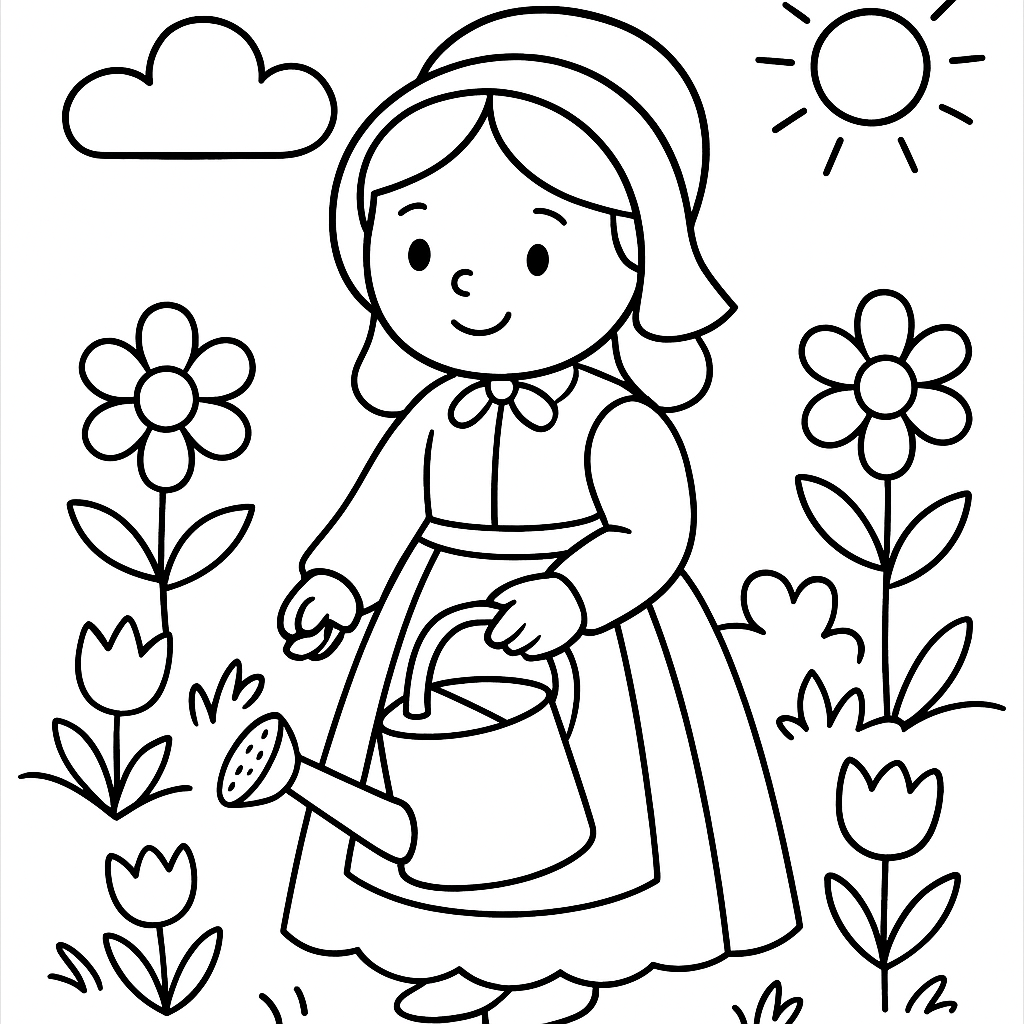 A simple coloring page featuring Mary, Mary, Quite Contrary with her spring garden. Perfect for kids (4-6) with large, bold outlines for a fun coloring experience.