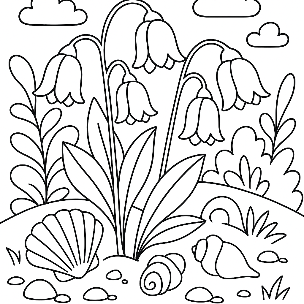 A medium coloring page featuring Mary's garden with silver bells and cockleshells. Perfect for kids (4-6) with moderately detailed outlines for a fun coloring experience.