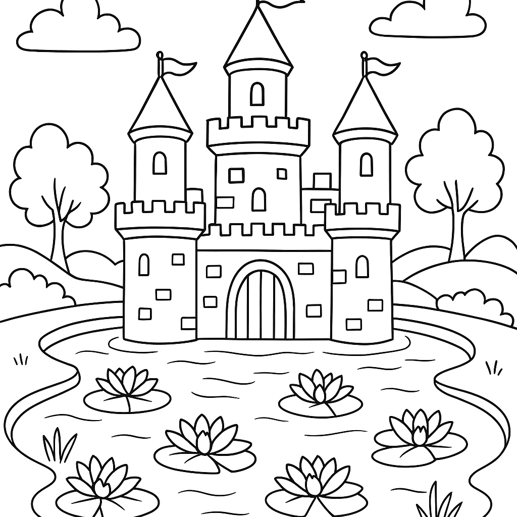A medium coloring page featuring a castle surrounded by a moat filled with spring water lilies. Perfect for kids (6-9) with moderately detailed outlines for a fun coloring experience.