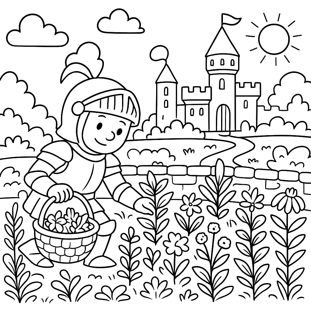A medium coloring page featuring castle garden with knight tending to herbs and medicinal plants. Perfect for kids (6-9) with moderately detailed outlines for a fun coloring experience.