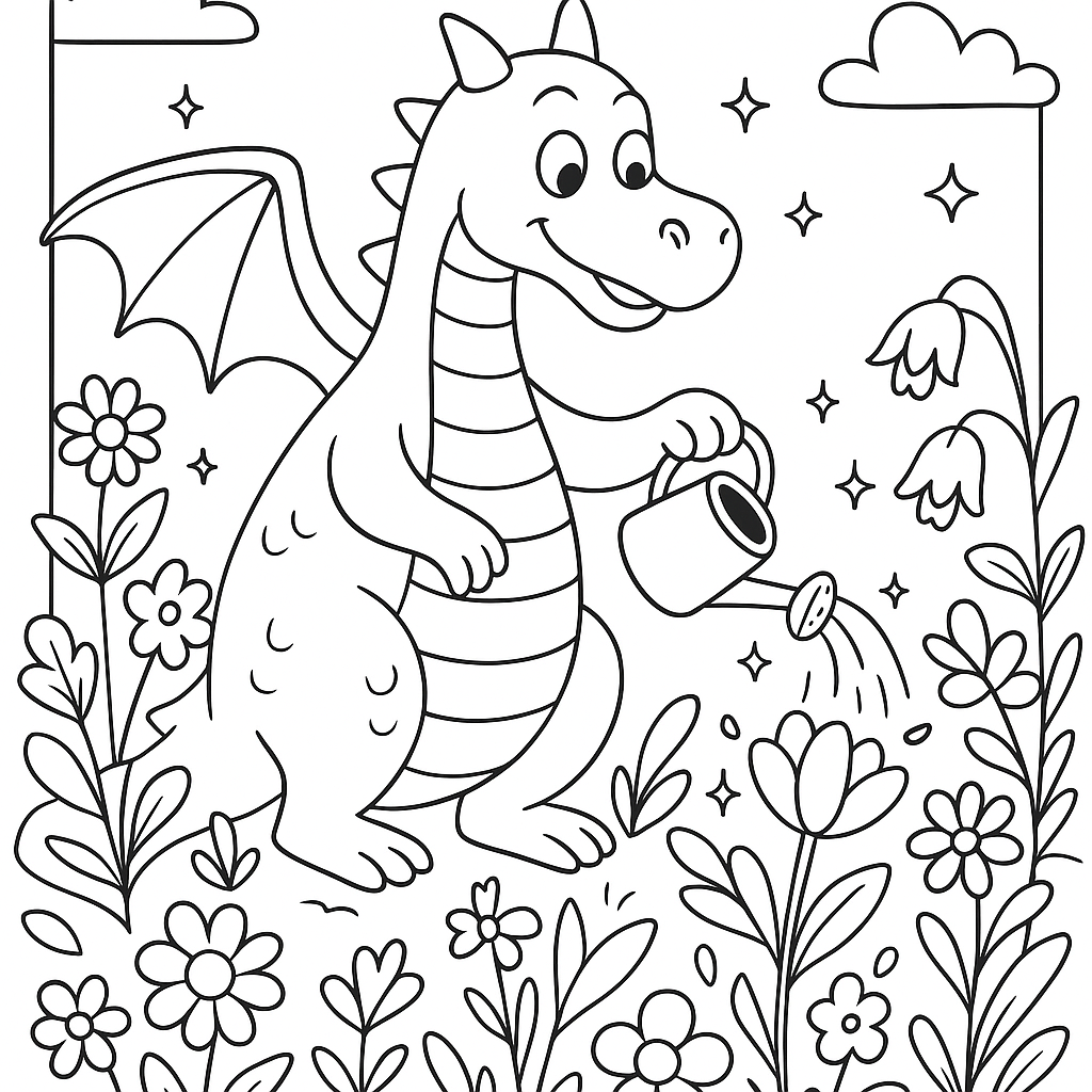 A detailed coloring page featuring a friendly dragon tending magical garden. Perfect for kids (6-9) with intricate detail for a fun coloring experience.