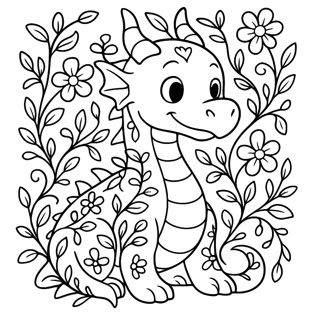 A medium coloring page featuring friendly plant dragon with vines and flowers growing from its scales. Perfect for kids (6-9) with moderately detailed outlines for a fun coloring experience.