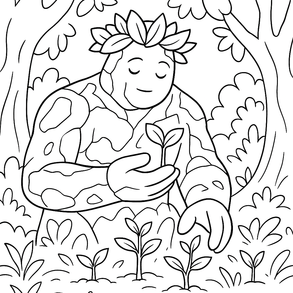 A medium coloring page featuring a magical earth guardian nurturing a forest of growing saplings. Perfect for kids (6-9) with moderately detailed outlines for a fun coloring experience.