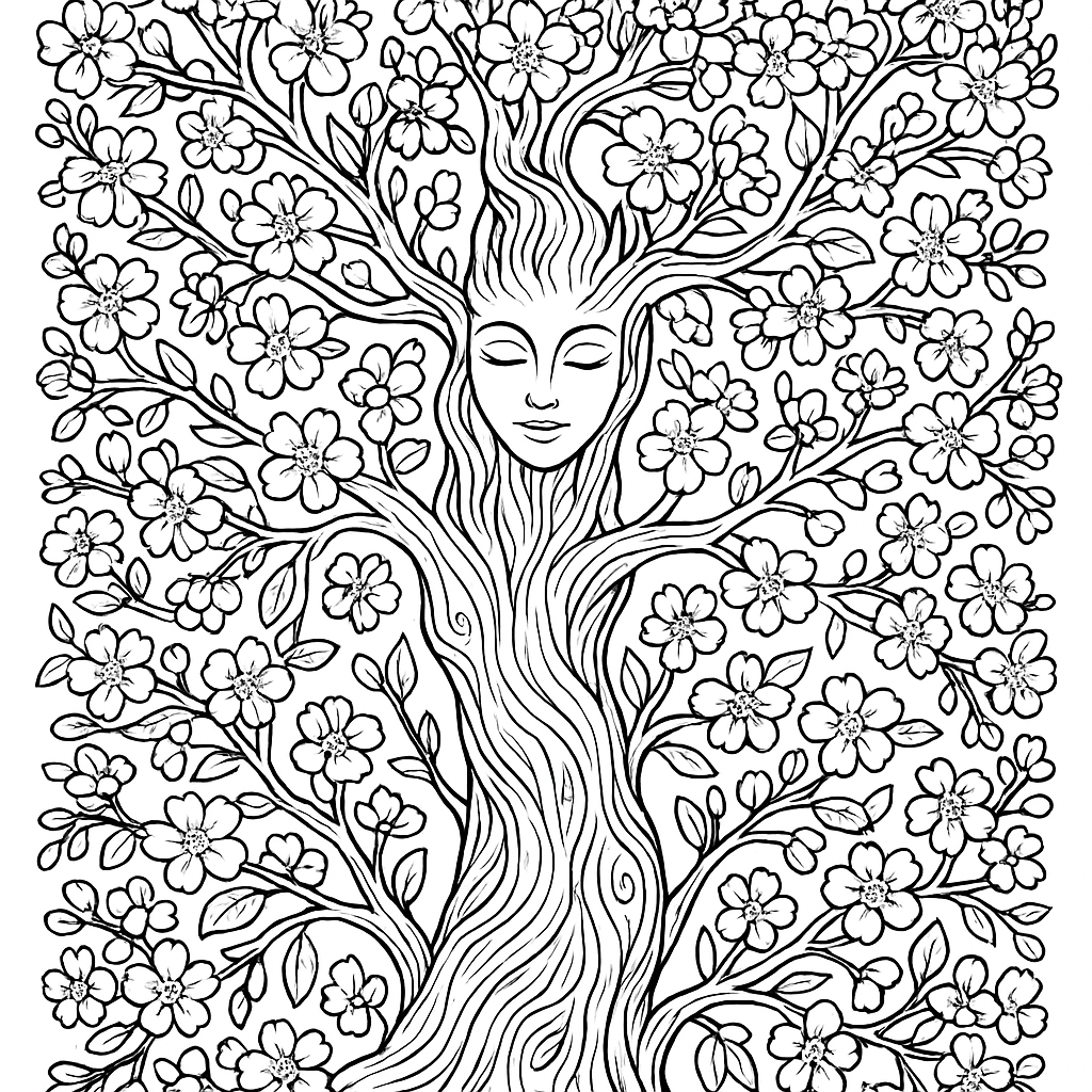 A detailed coloring page featuring a tree spirit emerging from blooming cherry blossoms. Perfect for tweens (9-12) with intricate detail for a fun coloring experience.