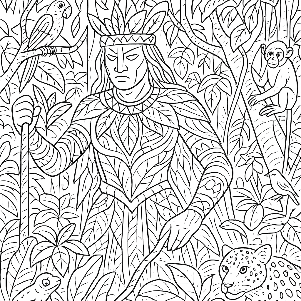A detailed coloring page featuring earth guardian protecting endangered rainforest. Perfect for tweens (9-12) with intricate detail for a fun coloring experience.